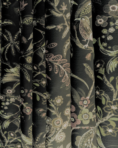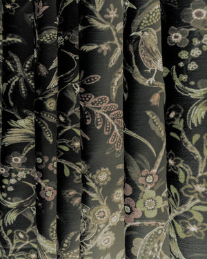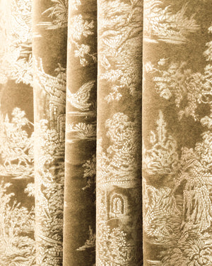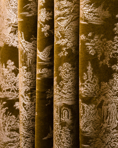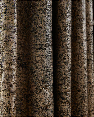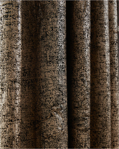 The Tuscany Foil-Printed Velvet Curtains command attention with their striking patterns, shimmering with metallic allure.