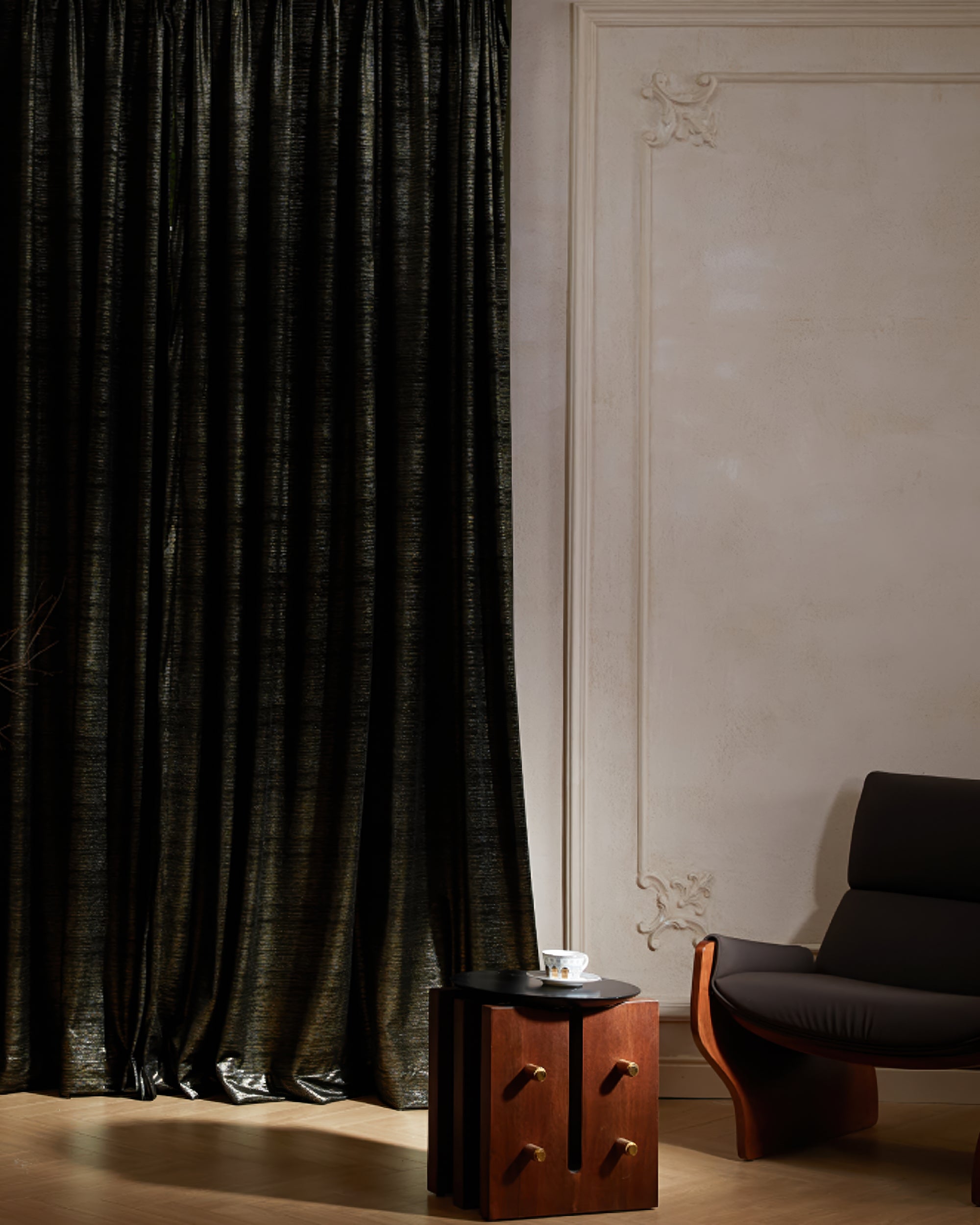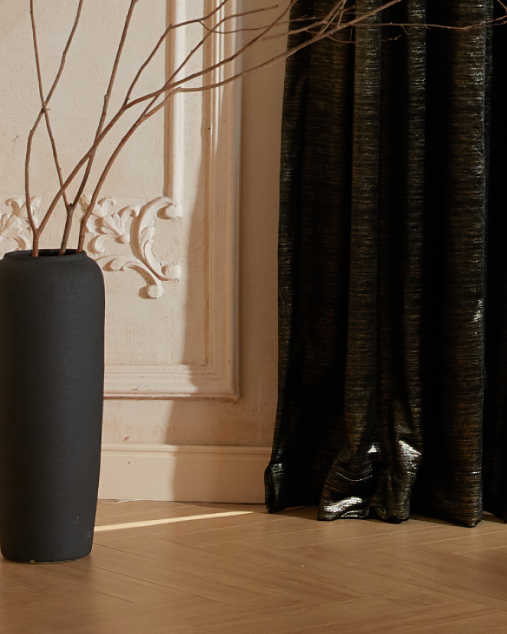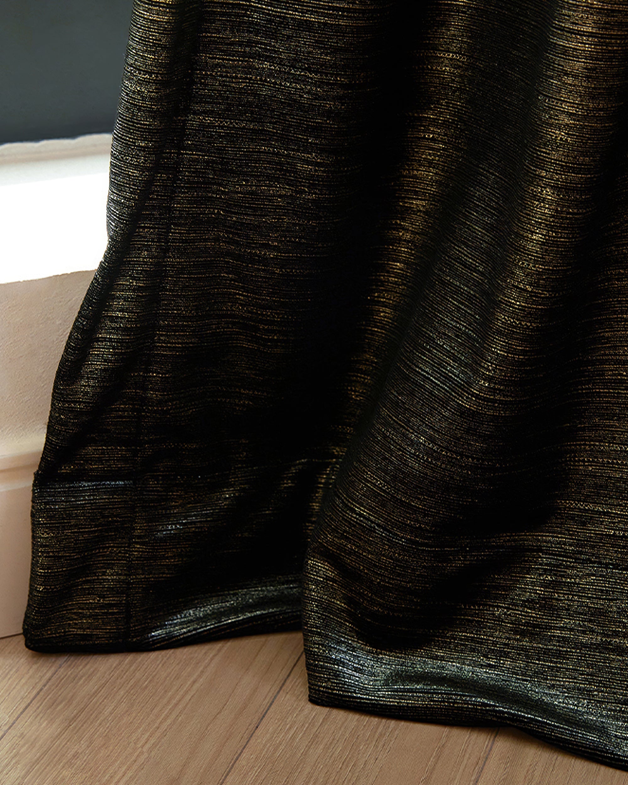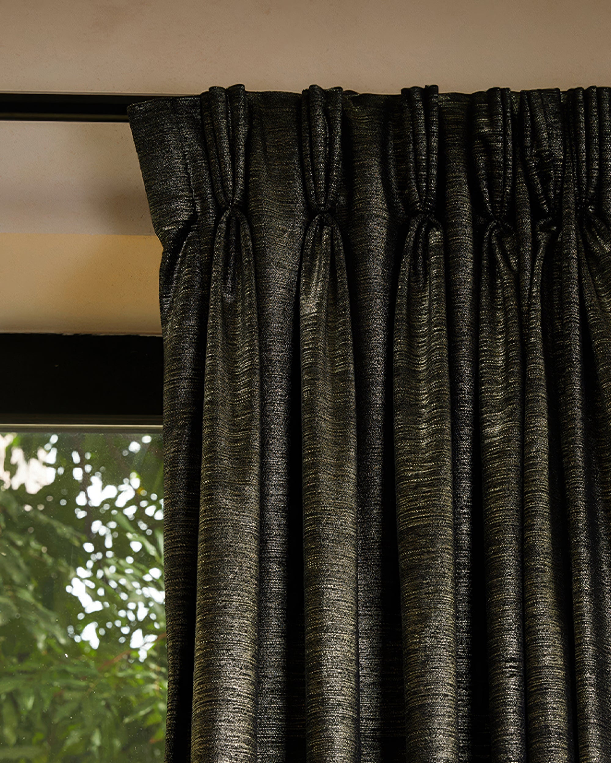 Rome Samtvorhang mit dreifacher französischer Quetschfalte, 130 x 290 cm, schwarzer Foliendruck