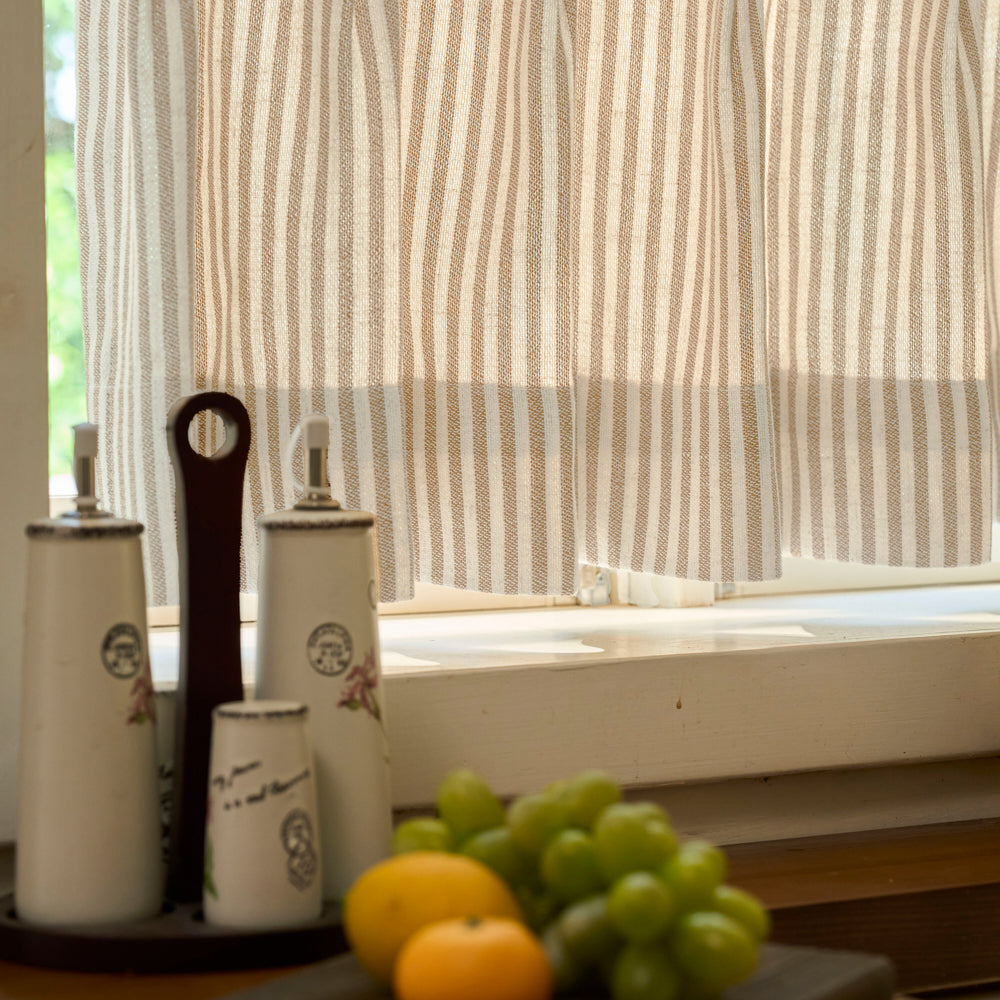 Rideau de café semi-transparent à rayures en mélange de lin brut sur mesure