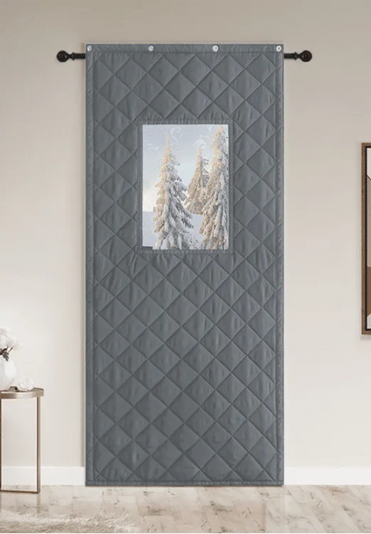 Dark gray quilted Oxford custom door curtain featuring a PVC clear window with snowy trees. Thermal insulated & soundproof window treatment.
